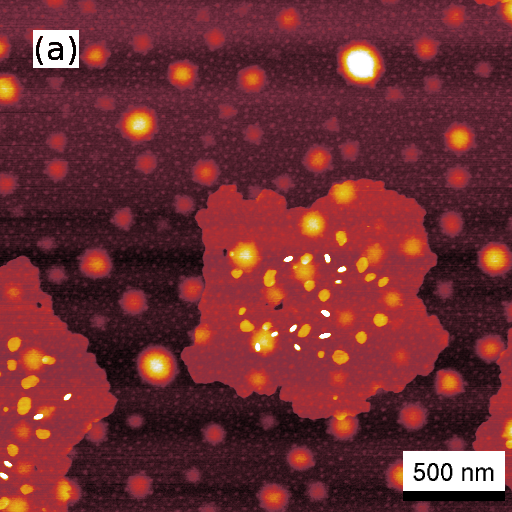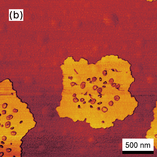 AFM height image of a 1.3 nm thick 6P film grown on a modified mica(001) surface. Corresponding phase image to (a) revealing that the large 6P islands grow directly on the modified mica surface.